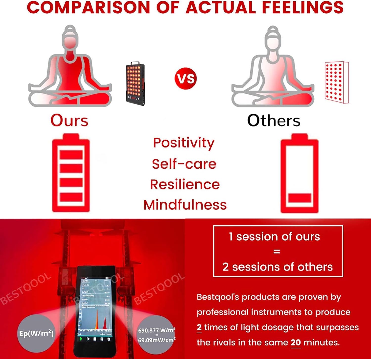 - Restore Your Healthy And Strong Self: Powerful and price-worthy dual chip 660nm 850nm LEDs as well as their portable travel size make BQ40 a secure and convenient red light therapy. Maintain your appearance at its best with red light therapy for body no matter where you are. Power consumption: 50W. The greater the power consumption, the better effect you get.
