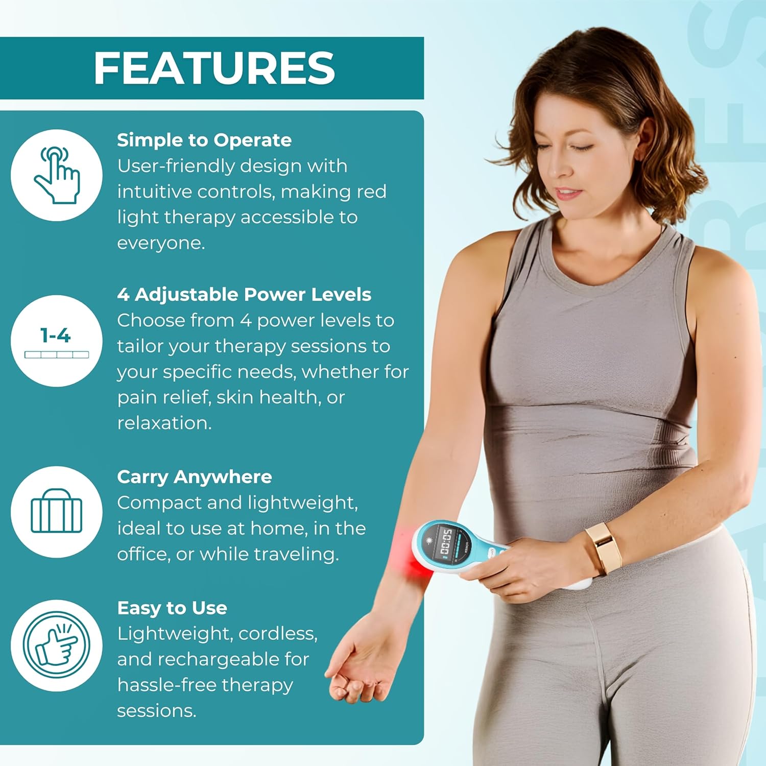 - CUSTOMIZABLE SETTINGS FOR COMFORT: With this handheld red light therapy, choose from 4 intensity levels and set the adjustable timer (5/10/15/20 minutes) for a personalized experience. Tailor your sessions to fit your needs, whether at home or on the go.